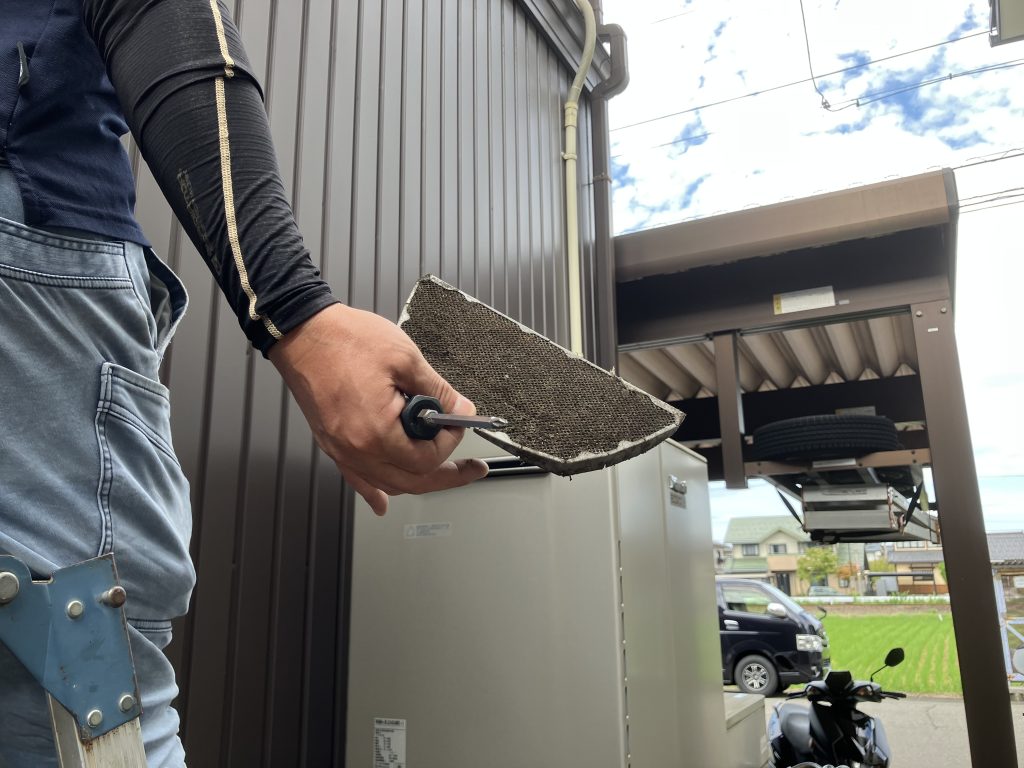 まずは、エアコン内部にコウモリがいないことを確認し、家全体のエアコン3台の配管まわりを、隙間を埋めるパテでしっかりと塞ぎ、コウモリが侵入できないように対策しました。これで安心してお過ごしいただけますね。