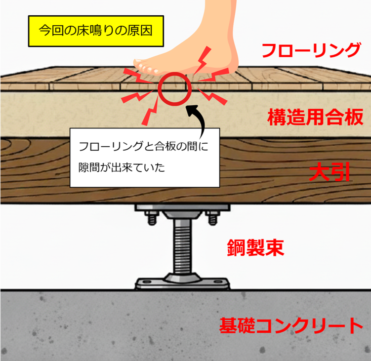 現地を確認したところ、床を踏むと高い「パキッ」という乾いた高い音が鳴っていました。