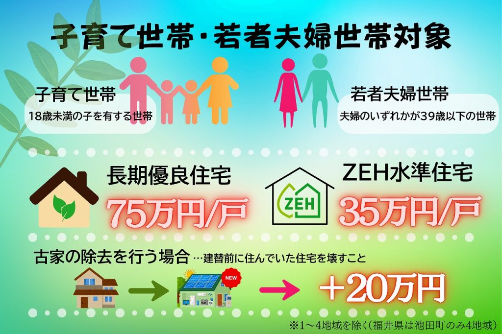 子育て世帯または若者夫婦世帯は、「長期優良住宅」または「ZEH水準住宅」を新築・購入する場合に、以下の補助を受けられます。
