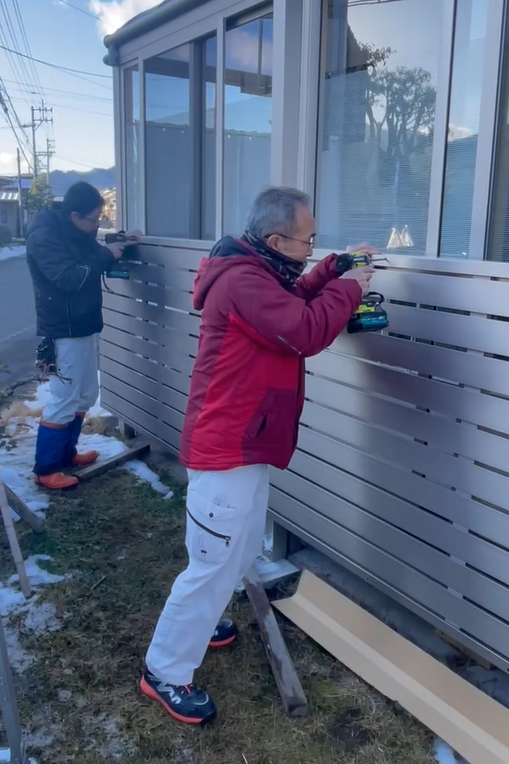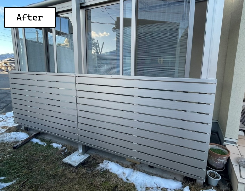 毎年冬になると、屋根から落ちる雪の影響で除雪が大変、さらに大野の雪は水分を多く含んで重いため、ガラスが耐え切れず割れてしまう心配もお悩みのひとつでした。そんな不安を解消するために私たちが手掛けた「雪囲いフェンス」の雪国特別カスタマイズ事例をご紹介します!